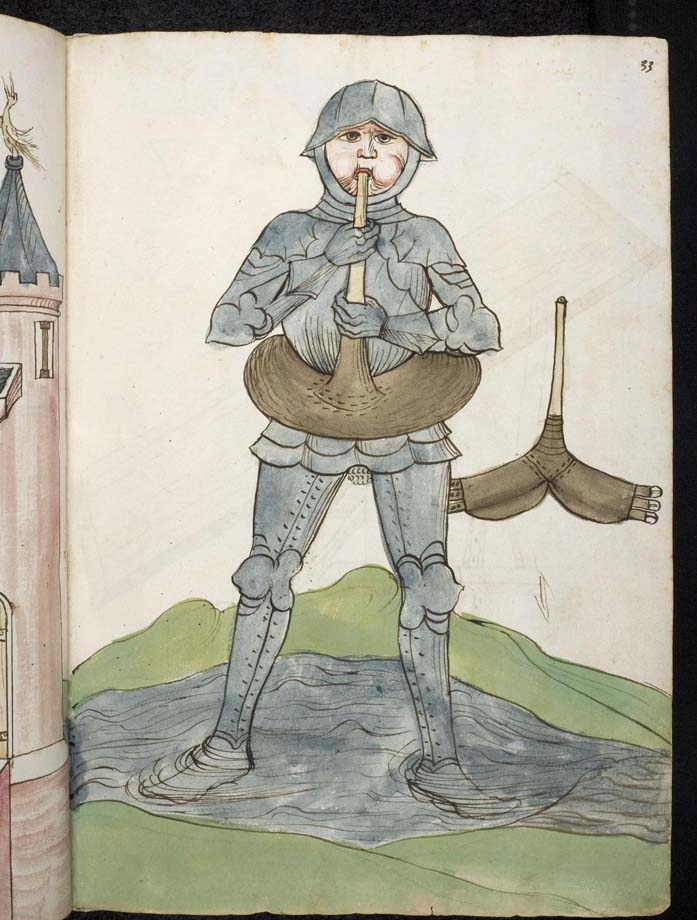 dmitrijan: На картинке водолоз в доспехах надувает воздушный круг, чтобы сделать доспех легче, что логично. Но не объясняет зачем вообще его надо надевать этот доспех. Либо чтобы прикинуться своим, либо чтобы не сожрали, но герметичность доспеха явно не для водной среды, да и полегчал бы он там. На рисунках есть костюмы с хвостиками аля резина, они больше похожи на водные, но они скорее с запасом грузиков, чтобы погрузиться.