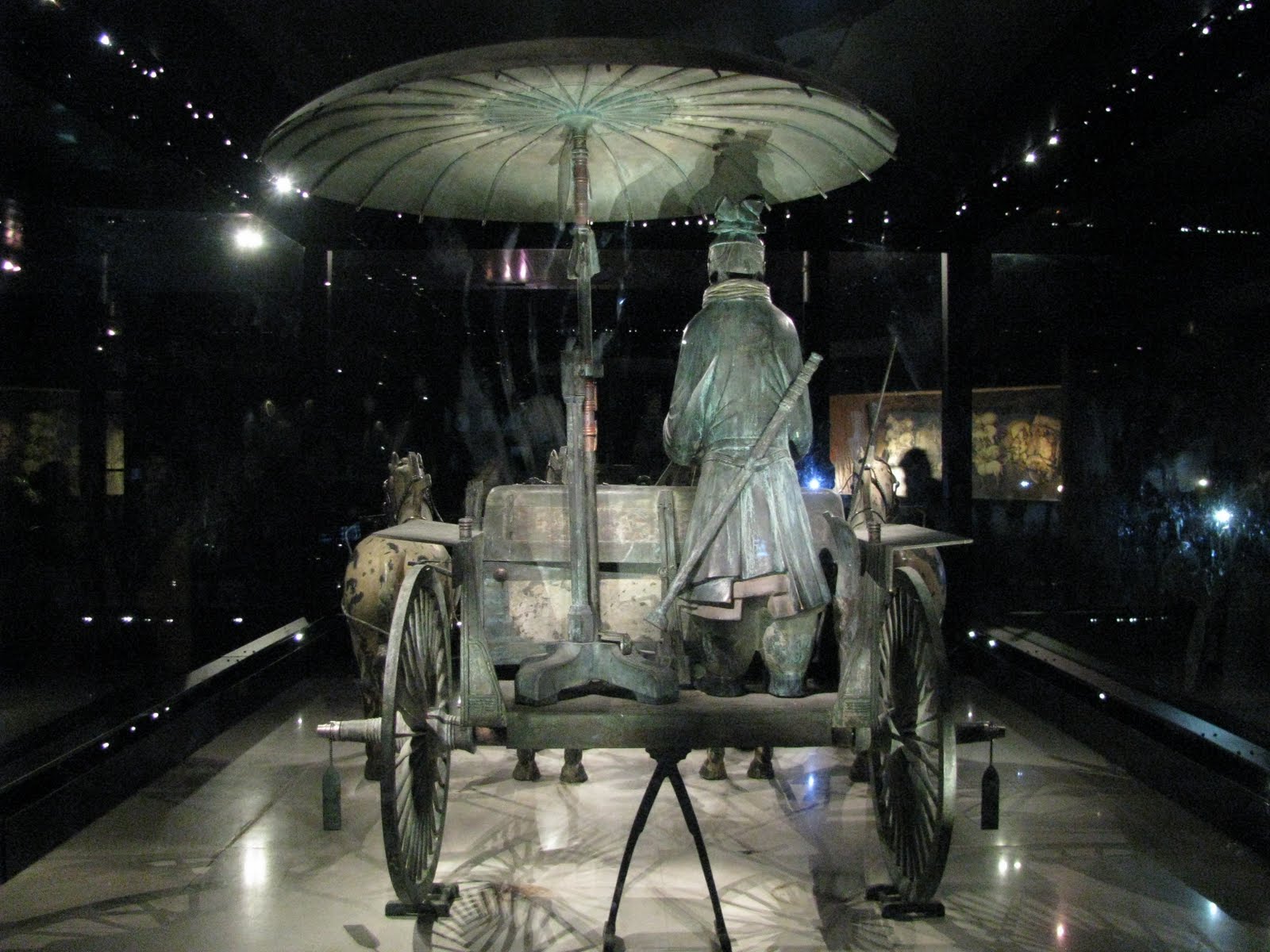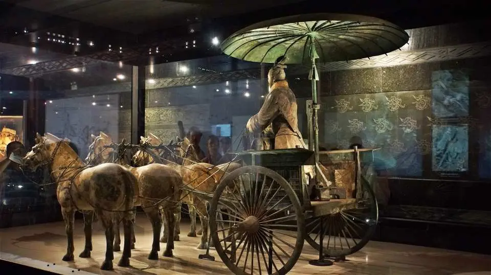 Далее цитата: «Бронзовые колесницы, извлеченные из могильника Цинь Шихуана, — образец и высшее достижение бронзового литья в Древнем Китае, свидетельствующее о высоком уровне металлообработки в те времена. Всего в раскопах насчитали более 3 тысяч скульптур и фрагментов бронзовых боевых колесниц. Поражает мастерство, с каким древние мастера соединяли детали. Они использовали для этого сварку, механическое соединение: втулочно-шарнирное, кнопочное, дышловое. Интерес вызывает зонт-крыша, венчающий колесницы. У первой колесницы зонт-крыша имеет в толщину всего 0,1 сантиметра при размере поверхности в 1,12 кв. метра, у второй колесницы крыша имеет в толщину 0,4 см при размере поверхности 2,3 кв. метра. Надо было владеть высоким уровнем литейной техники, чтобы изготовить такие крупные и в то же время тонкие и равномерные по толщине бронзовые детали. До сих пор сохранилась подвижность деталей: двери и окошки колесниц легко открываются и закрываются, поперечина на оглобле приводит в движение колеса, так что колесница может двигаться.